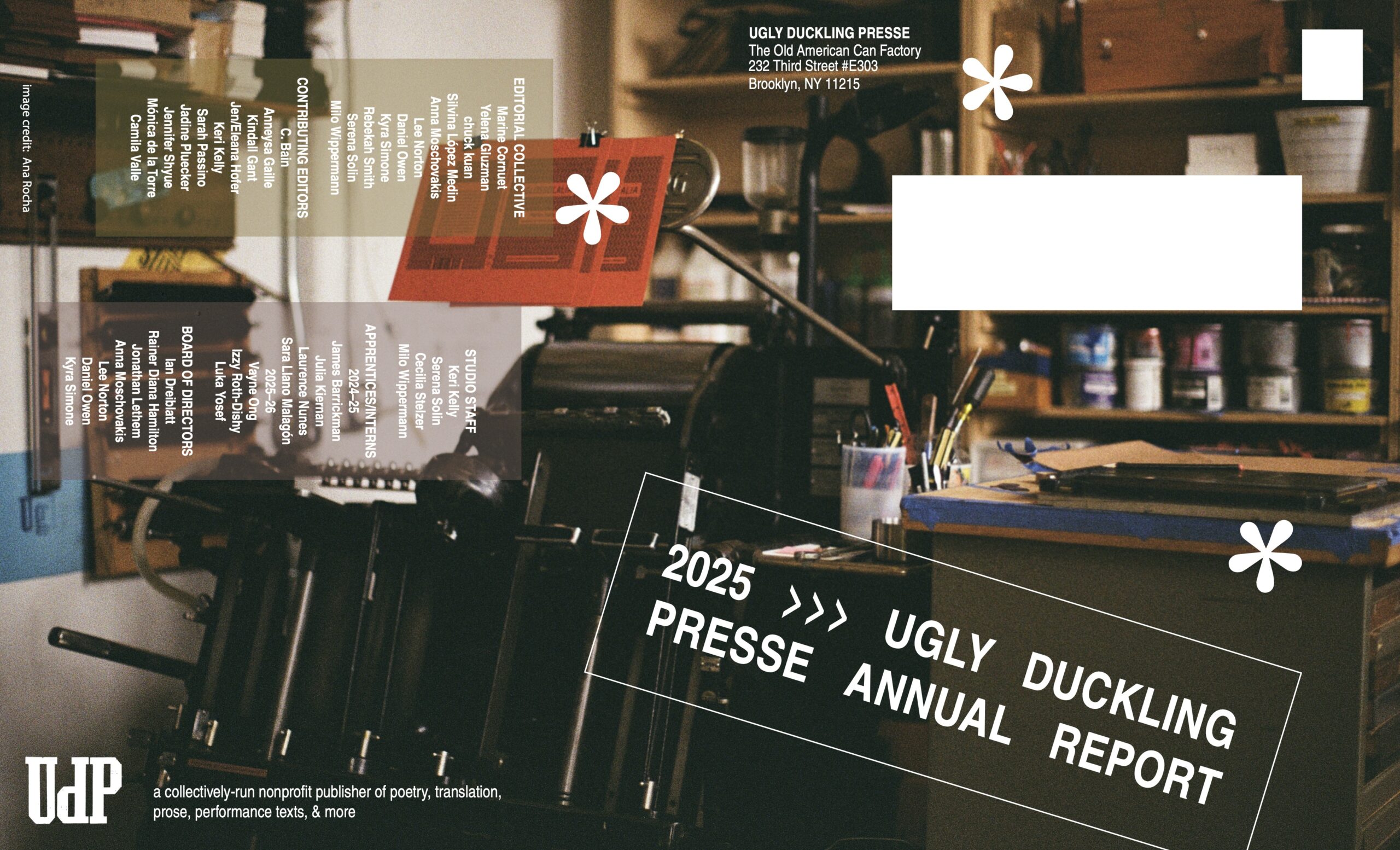 Ugly Duckling Presse is a collectively-run, nonprofit publisher of poetry, translation, experimental prose, performance texts, and books by artists. Through the efforts of a volunteer editorial collective and small part-time staff, UDP has published more than 400 titles to date and produced countless prints and ephemera.
